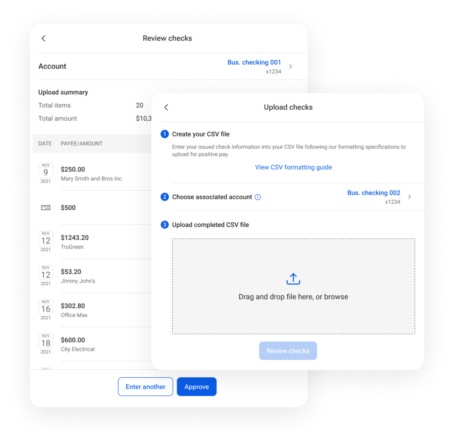 Any payment that does not match your authorized information is flagged as an exception and made available for review through Business Online Banking.